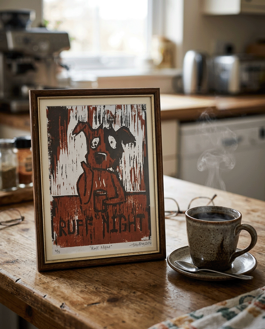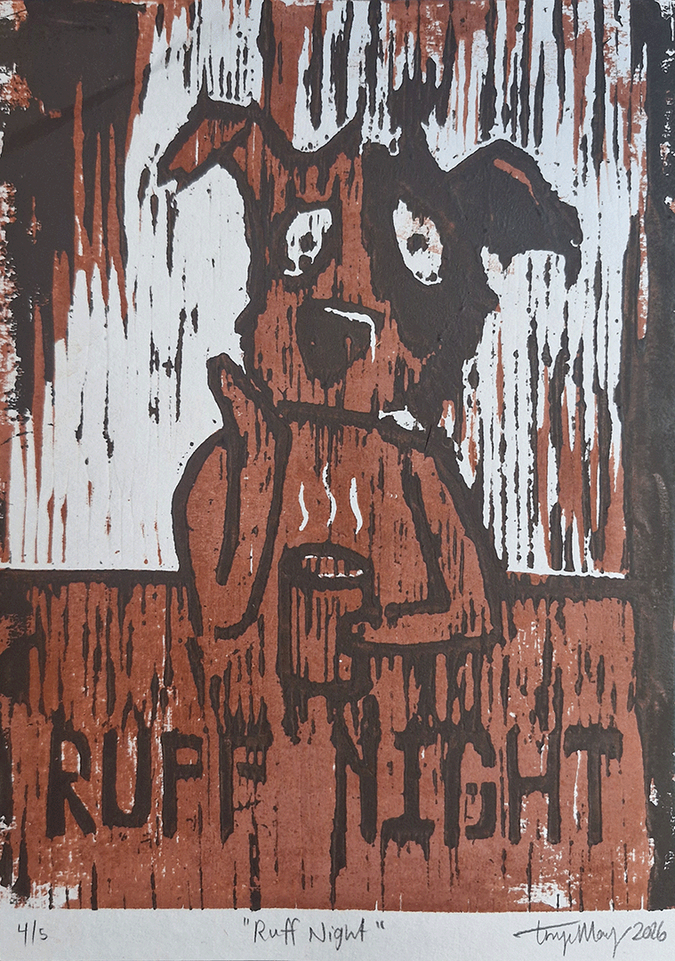 Reduction Woodcut Print: Ruff Night 4/5